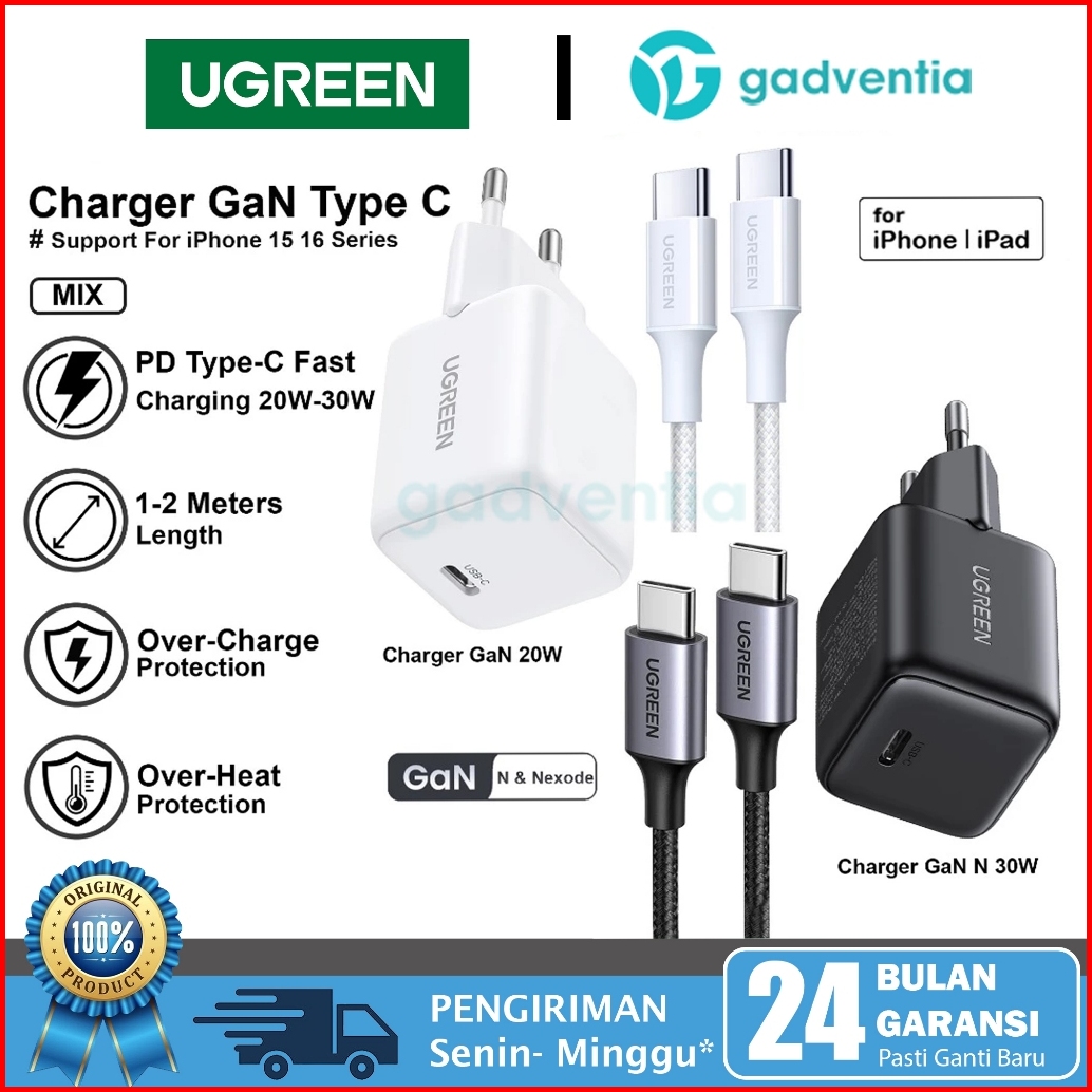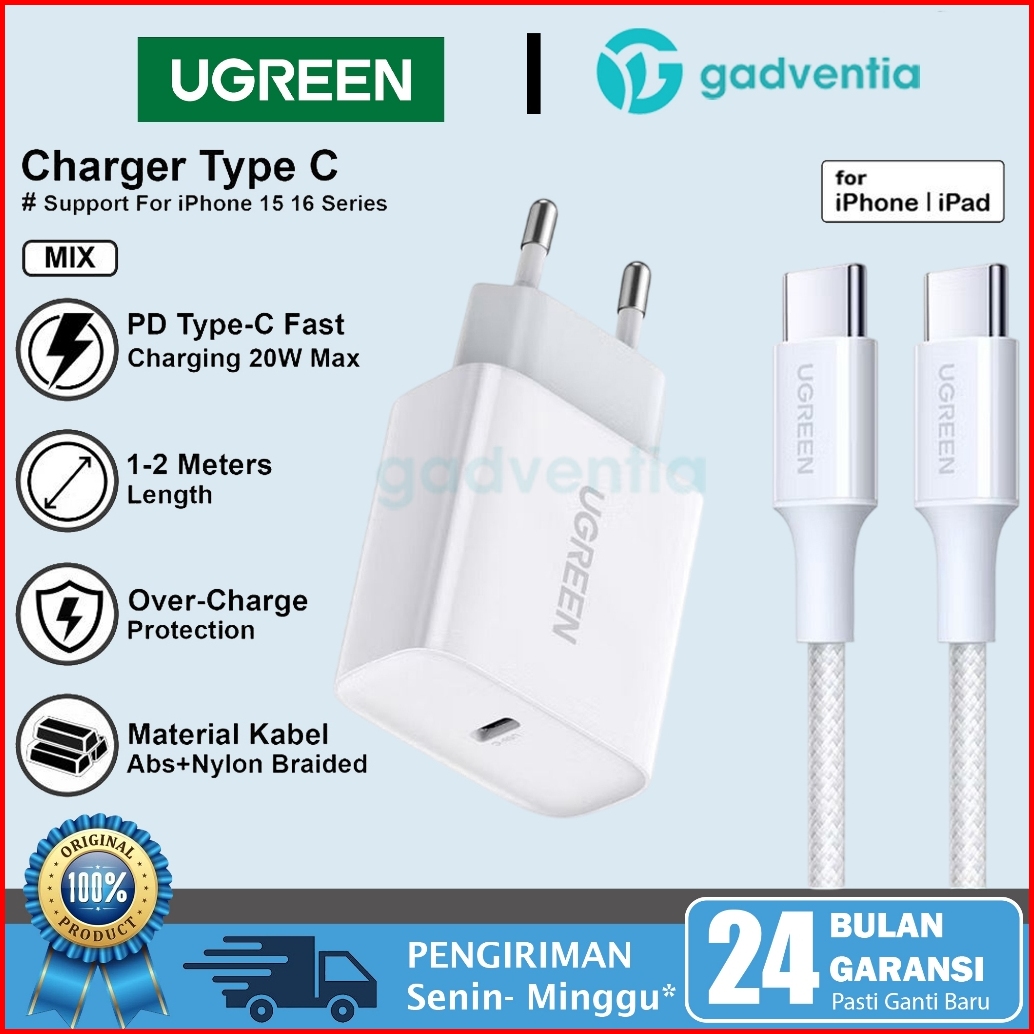 Ugreen Adaptor Charger Set For Iphone 16 15 15 Plus Pro Max Type C Pd Fast Charging 20w-30w Max