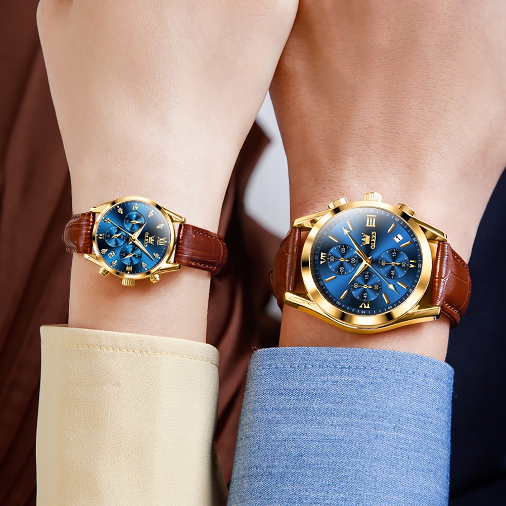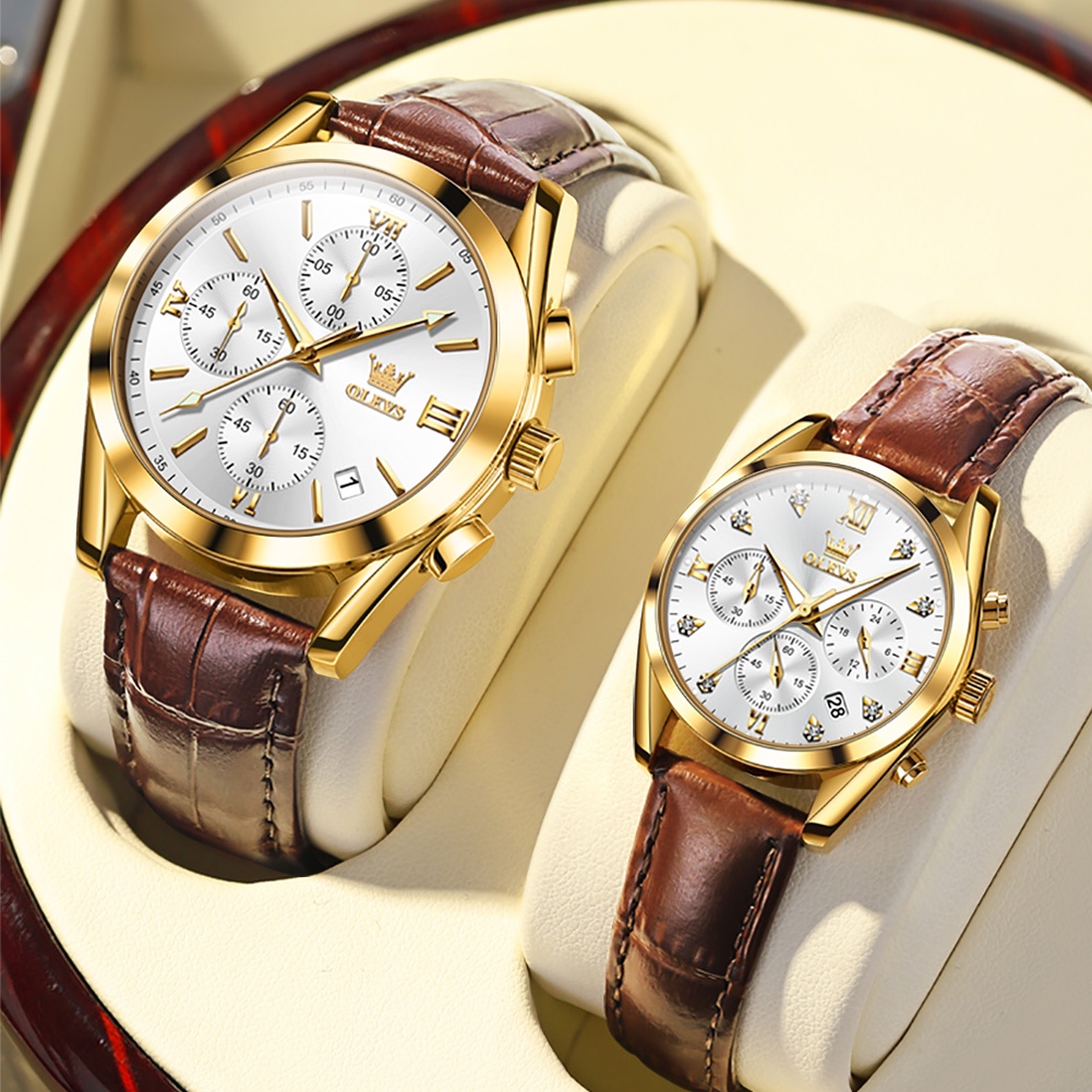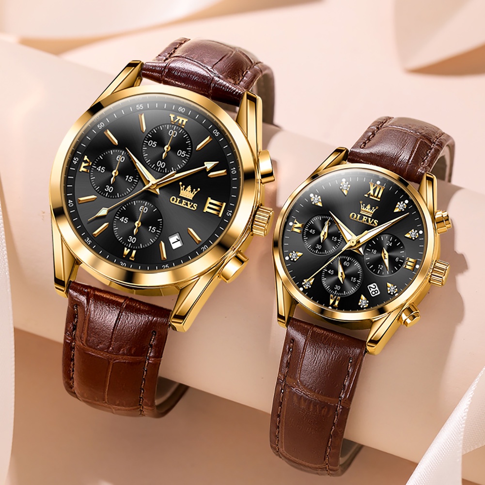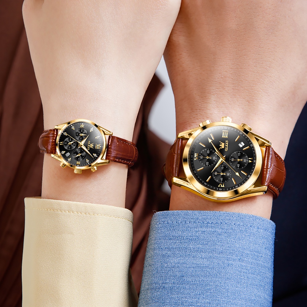 Jam Tangan Couple Olevs Pasangan Anti Air Original Kulit Hitam 2025 Luxury Chronograph Multifungsi Analog