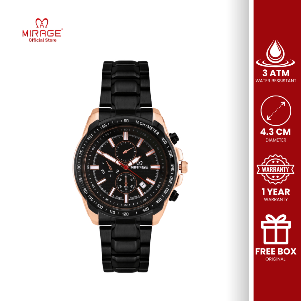 Jam Tangan Pria Mirage Original Chrono Formal Hitam Rosegold Tahan Air 8305 / 8904 M