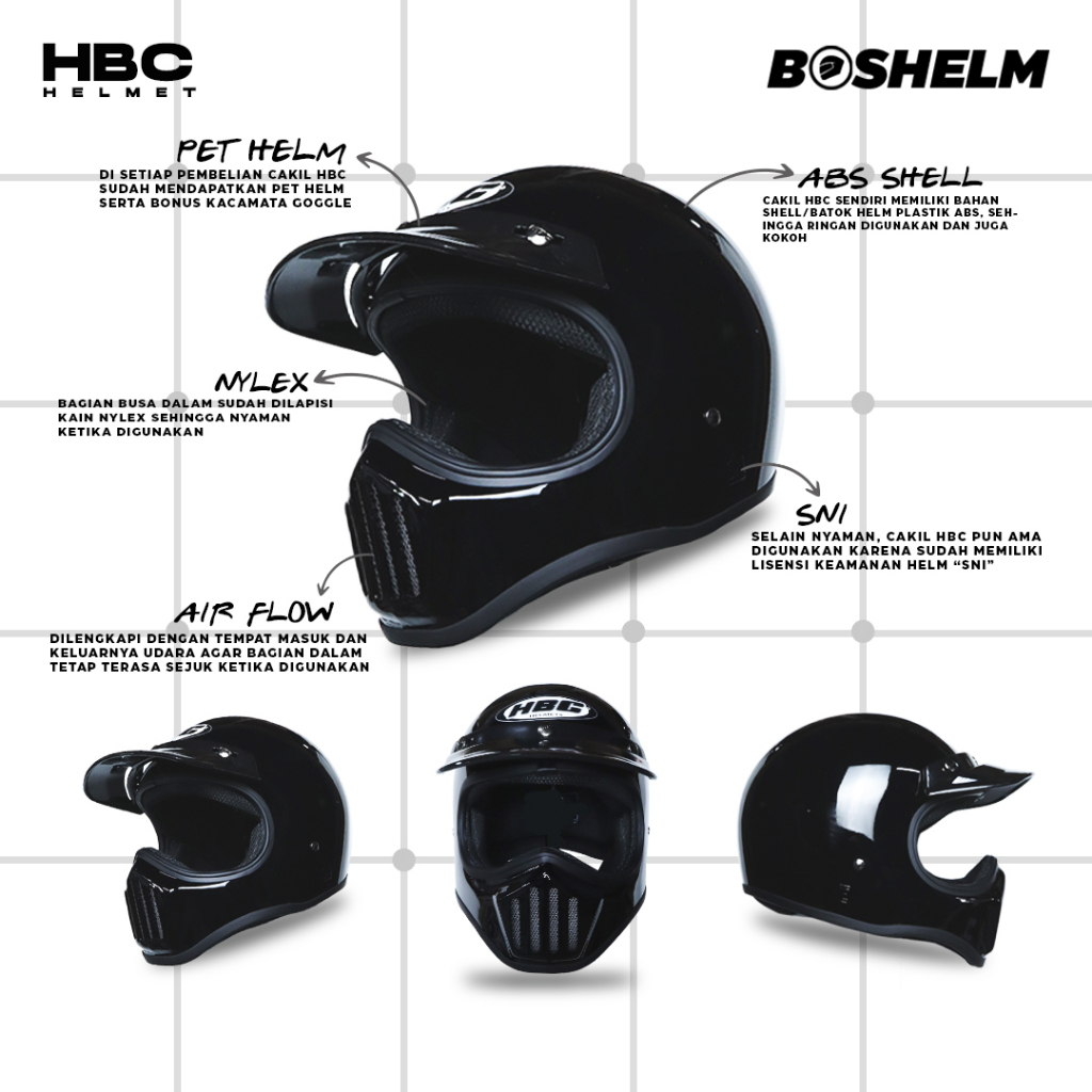 Helm BOSHELM Cakil HBC Full Face Retro Hitam Doff Inner Visor SNI