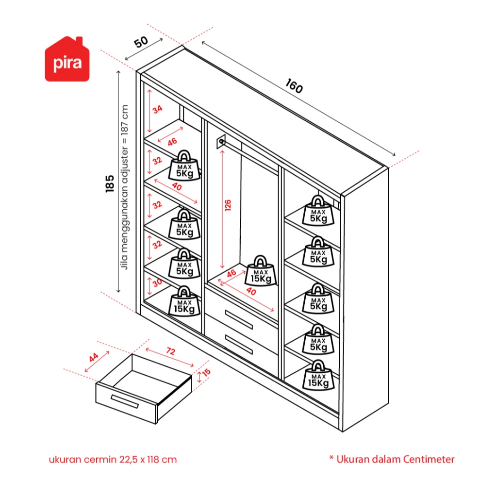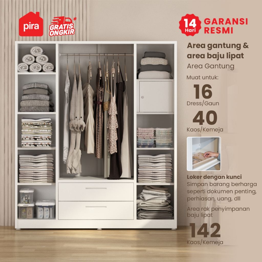 Lemari Pakaian Pira Saxon 4p 2dr Mwd Besi 4 Pintu Cermin 2 Laci