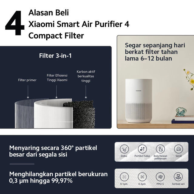 Air Purifier 360° Partikel Besar, Filter 3in1 Xiaomi Air Purifier 4 Compact Penjernih Udara