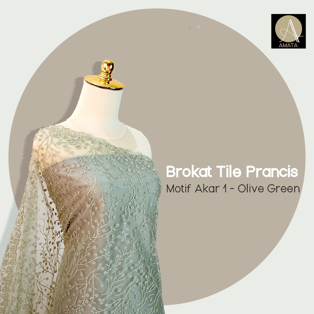Kain Brokat Tile Prancis 0.5 Meter Motif Akar Olive Green Premium Untuk Kebaya