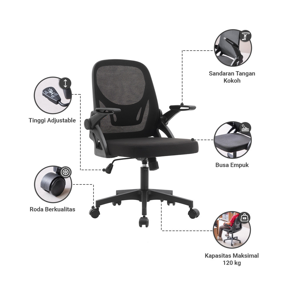 Kursi Kantor Sandaran Rendah Hitam Tempat Duduk Roda Informa Ken Office Chair