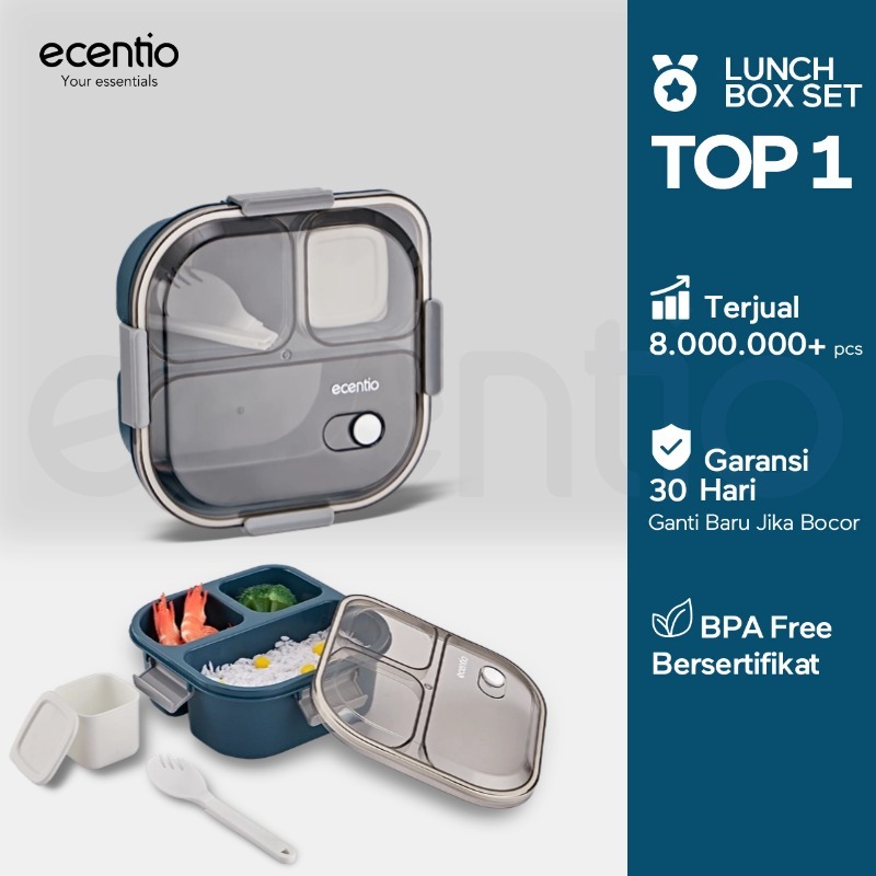 Lunch Box Ecentio Anti Tumpah 3 Grid 1100Ml Tempat Makan Kotak Sup 100Ml Free Sendok Anak Sekolah