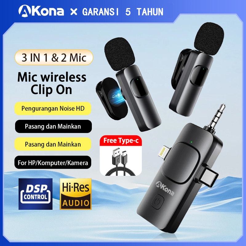 Mikrofon Wireless Akona 3 In 1 Clip On 2 Mic Noise Reduction Konten Kreator 3.5Mm Type-C Lightning Hp Kamera Komputer