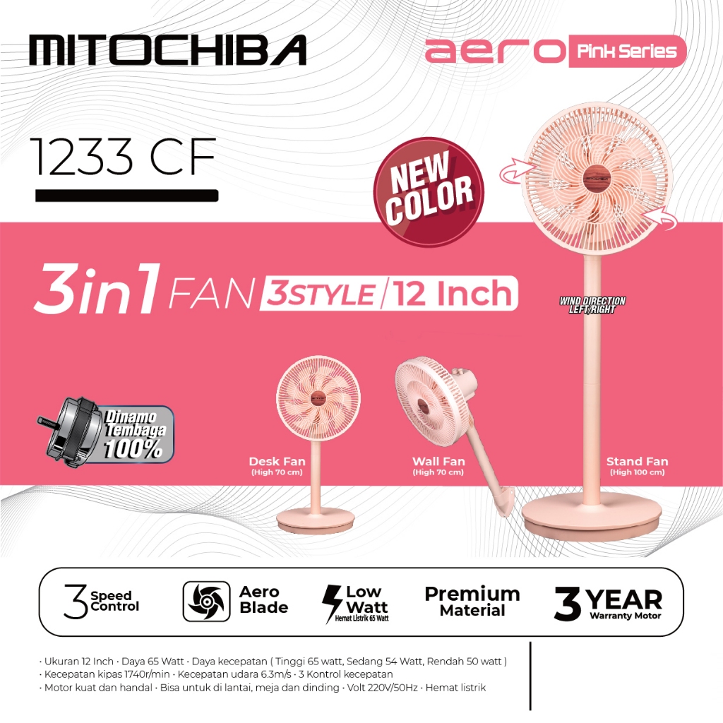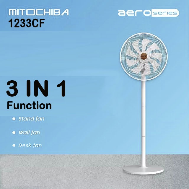 Fan 3in1, 12" Mitochiba Aero Series 1233cf Meja, Dinding, Berdiri