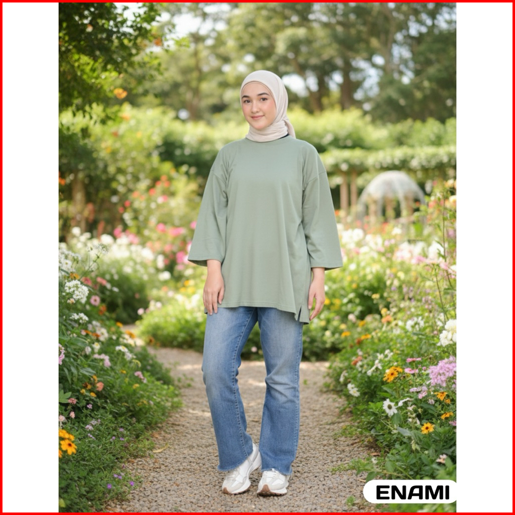 Enami Suns - Baju Kaos Oversize Wanita Lengan 7 8 - Cotton Shoft Nyaman Dipakai Hijap Friendly