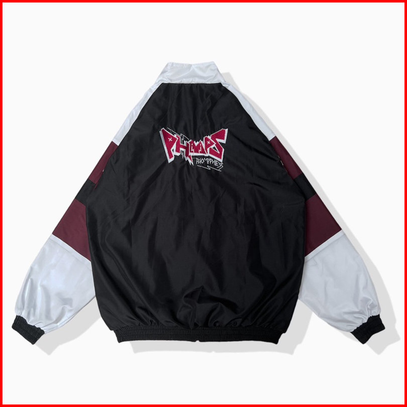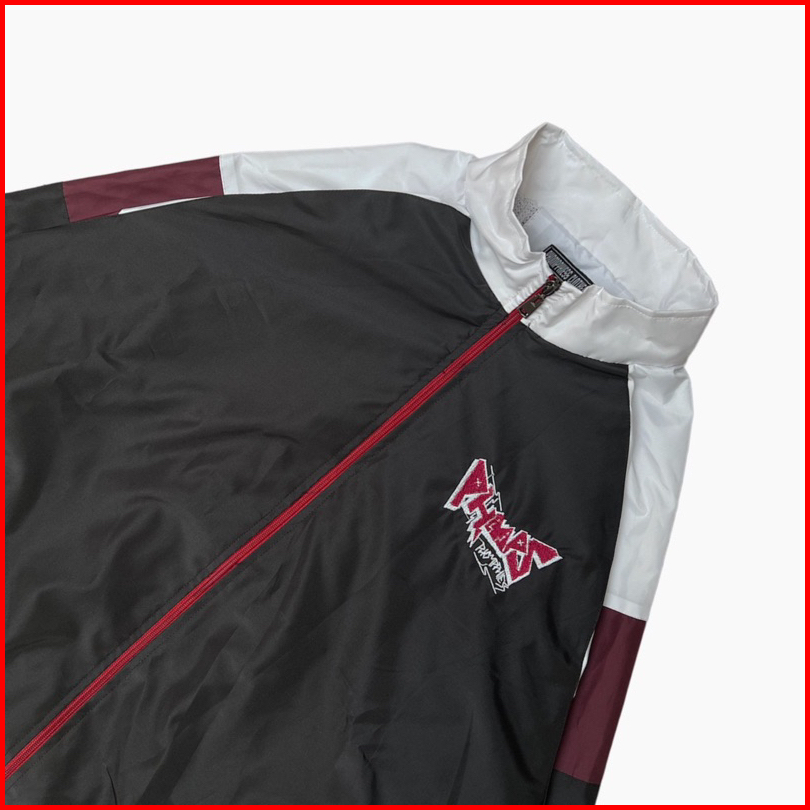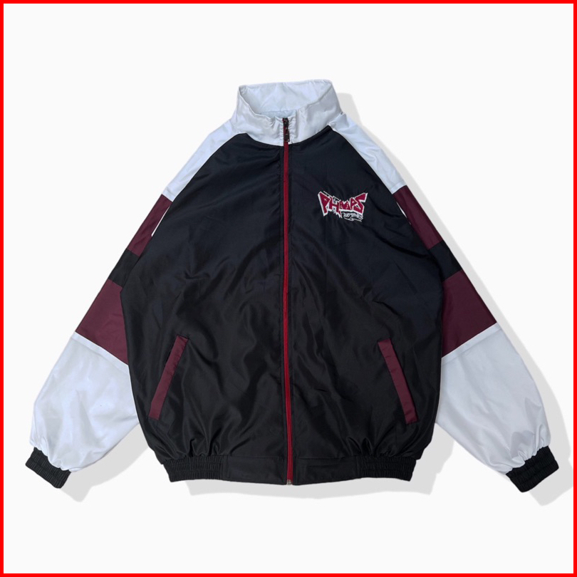 Phompphiess Jaket Retro Hitam Strip Maroon Jacket Sport Pria Wanita