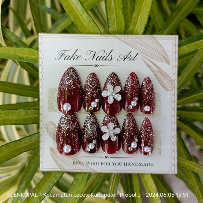 Kuku Palsu Lancip Maron Free Lem Gel Nail Art Wedding