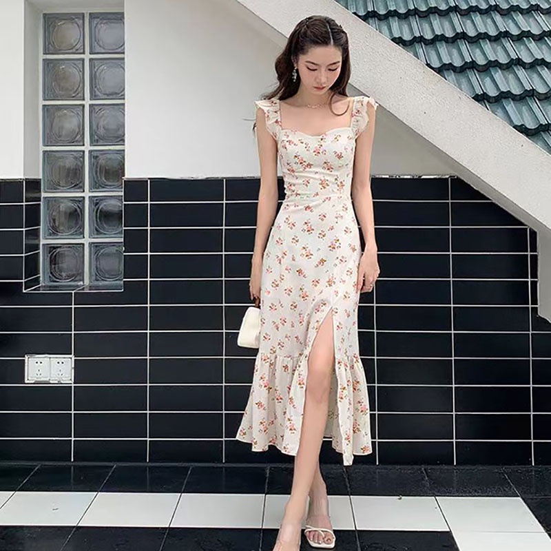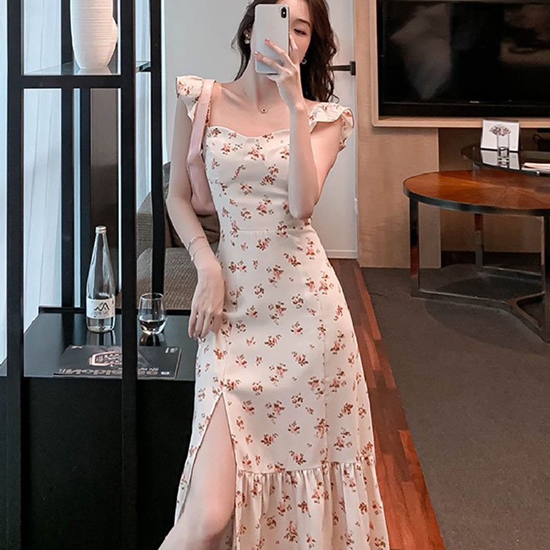 Dress Wanita Newlan QZ081 Butterfly Sleeve Cream Midi Dress with Slit - Dress Casual Kasual/Korean Dress Korea Fashion O