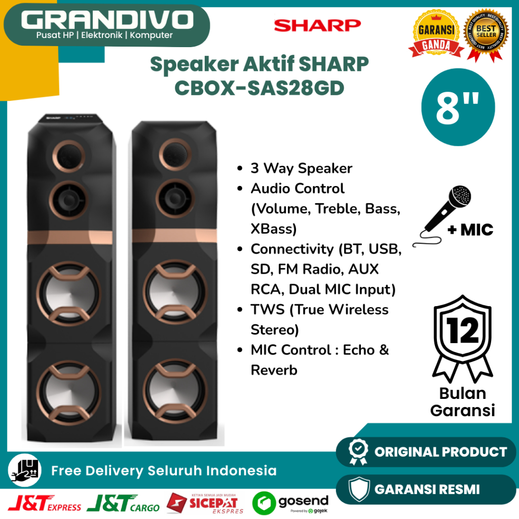 SHARP Speaker Aktif 8inch Double Woofer 3 Way XBass Bluetooth USB SD Card AUX RCA - CBOX SAS28GD/SR