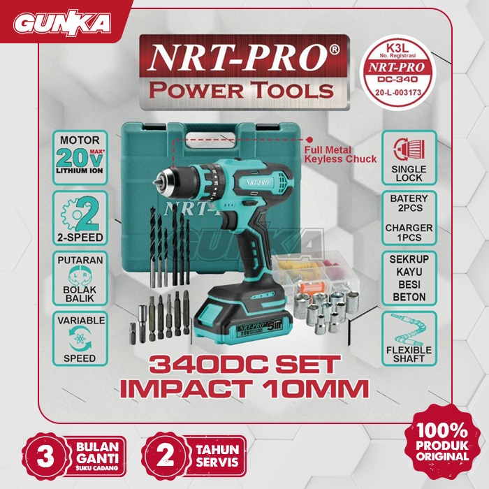 Cordless Impact Drill 20V +Acc Set (10 mm 2B1C) NRT-Pro 340+SetDC Mesin Bor Tembok Impak Beton Baterai Lithium Besi Kayu
