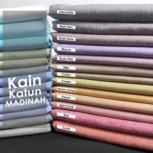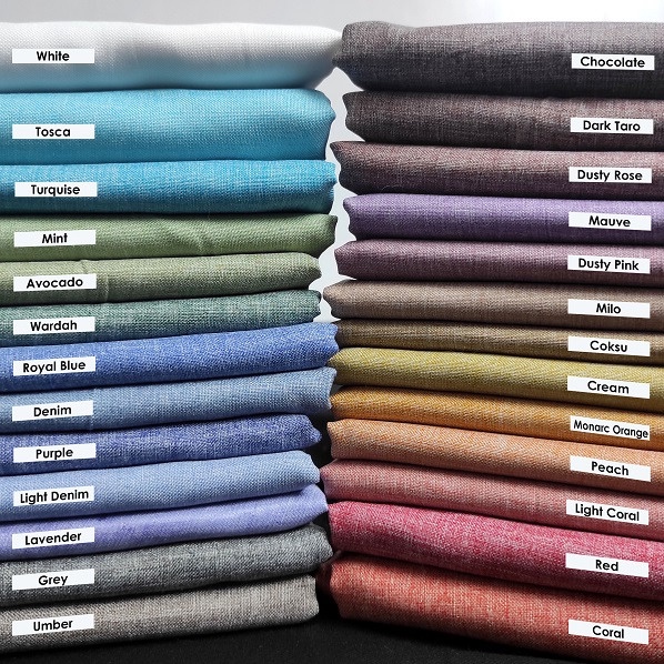Dusty Rose, Dusty Pink, Dark Taro, Chocolate, Umber, Grey, Purple, Royal Blue, Denim, Lavender, Light Denim, Mauve, Tosca, Turquise, Wardah, Avocado, Mint, Red, Light Coral, Coral, Cream, Monarch Orange, Peach, Milo, Coksu, White