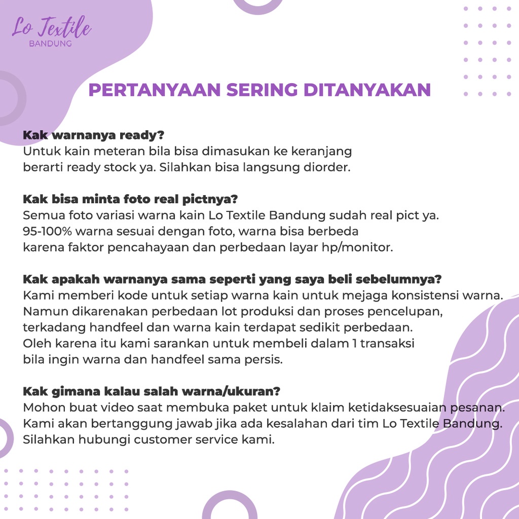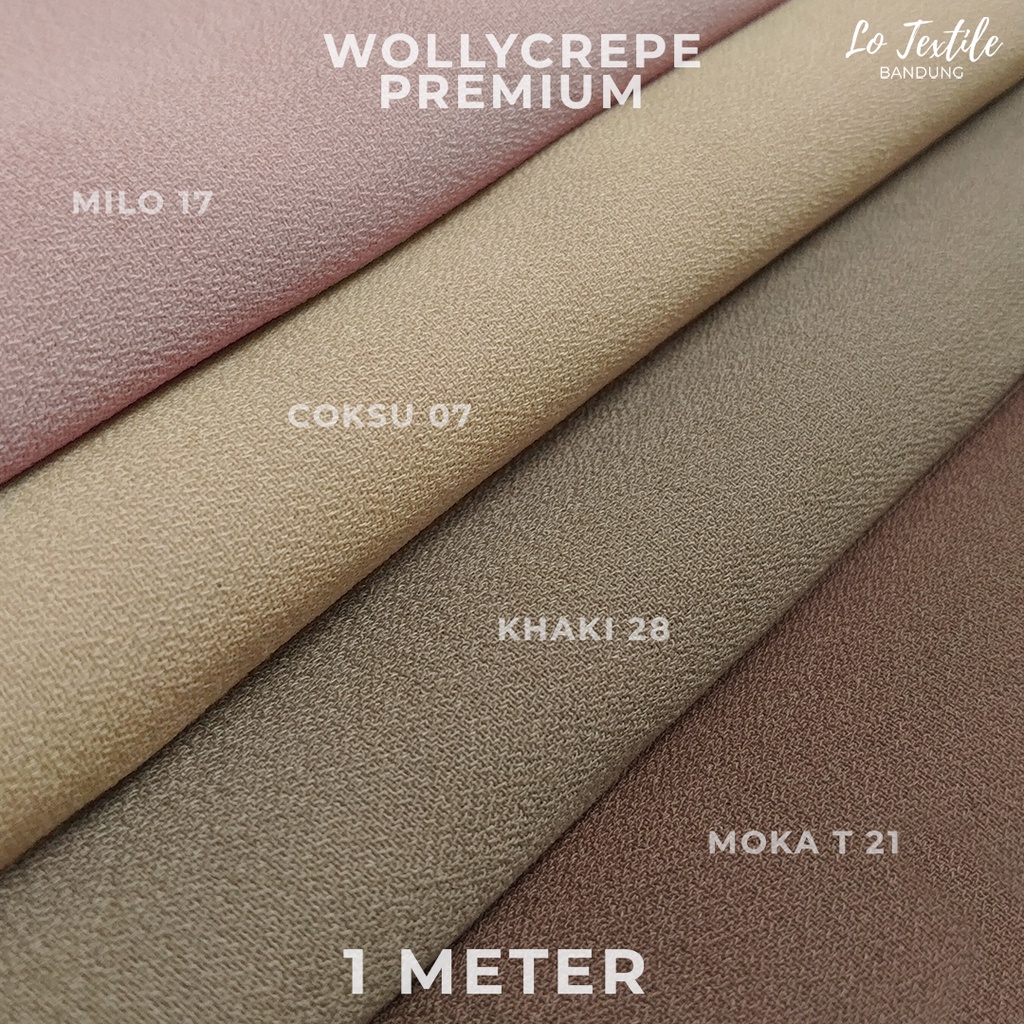 Hitam - 01, Navy - 14, Putih - 25, Broken White/BW - 04, Moka Tua - 21, Maroon - 09, Milo - 17, Abu Muda - 03, Biru Langit - 15, Khaki - 28, Avokado - 24, Abu Tua- 02, Dusty Purple - 11, Kubus - 06, Cream- 08, Ungu Lilac - 12, Blunerra - 13, Hijau Botol - 19, Army - 26, Baby Pink - 27, HIjau Toska - 30, Dove - 31, Salem - 32, Hijau Wardah - 34, Cokelat Milo - 36, Taro - 37, Lemon - 18, Ovaltine - 35, Coklat Susu - 07, Merah Bata - 22, Salmon - 16, Olive - 05, Dusty Pink - 20, Biru Wardah - 23, Fuchsia - 33, Ungu Taupe - 29, Warna Acak/1 Meter