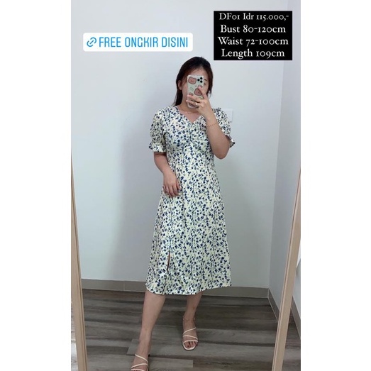 Dress Wanita ZLORE - #DF01 Floral Midi Dress Import / Broken White Flower Slit Dress (S-XXL)