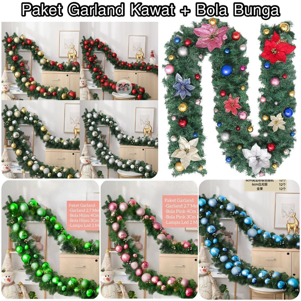 PAKET Garland Daun Kawat 2.7 Meter Bola Natal Bunga Cherry Hiasan Dekorasi Tangga Railing Natal Merry Christmas PREMIUM