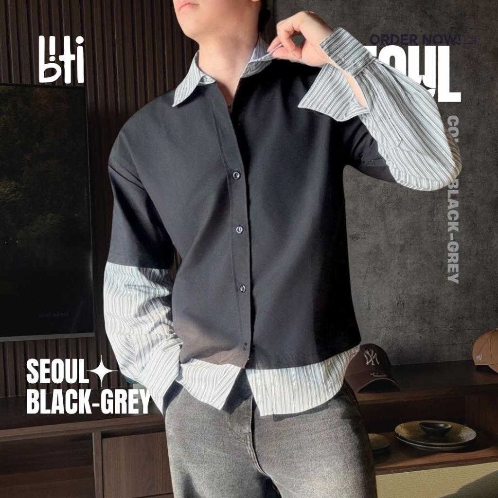 BITI Seoul Shirt | Kemeja Layer 2 in 1 Lengan Panjang Pria Hitam Garis