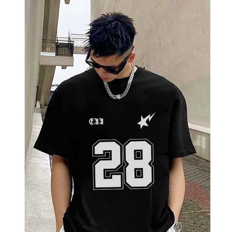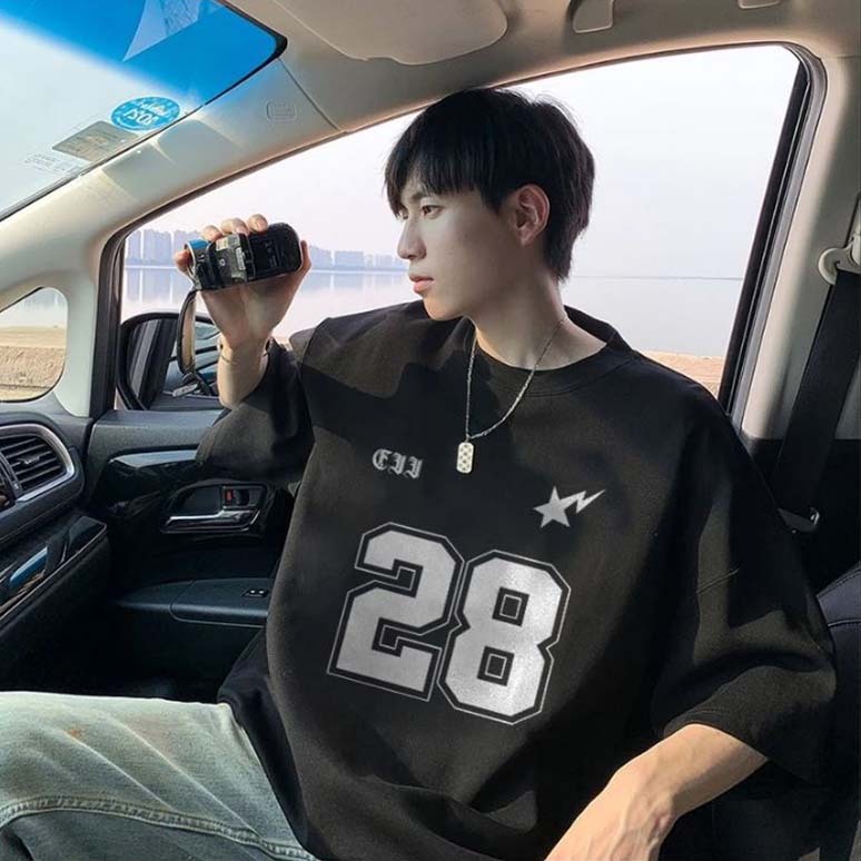 Baju Kaos Pria Lengan Pendek Oversize Vintage No.28 Dicetak Putih T Shirt Pria Atasan Washed Hitam Cowok Asli 100 PERSEN Retro Street Style