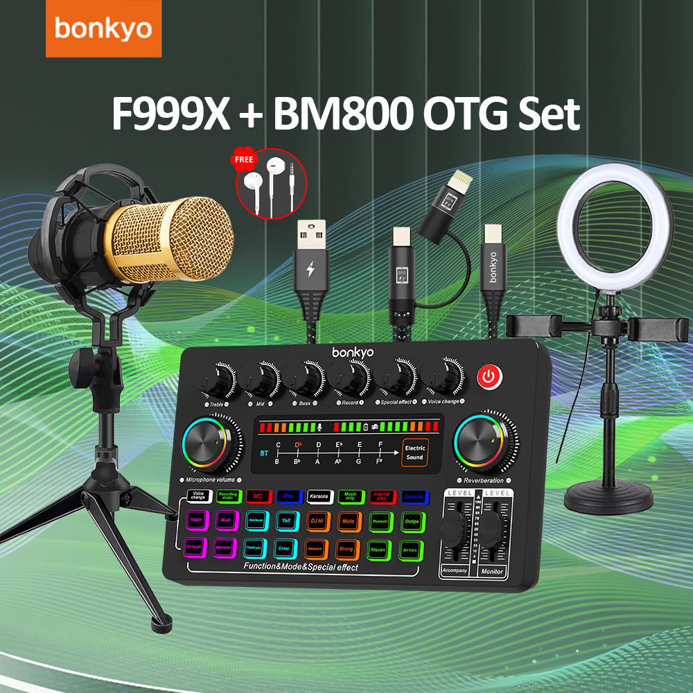 Bonkyo 【Set Streaming Lengkap】sound card F999X +BM800+2in1 OTG cable+Headset+ Lampu Penguat Cahaya - Ideal untuk Live St