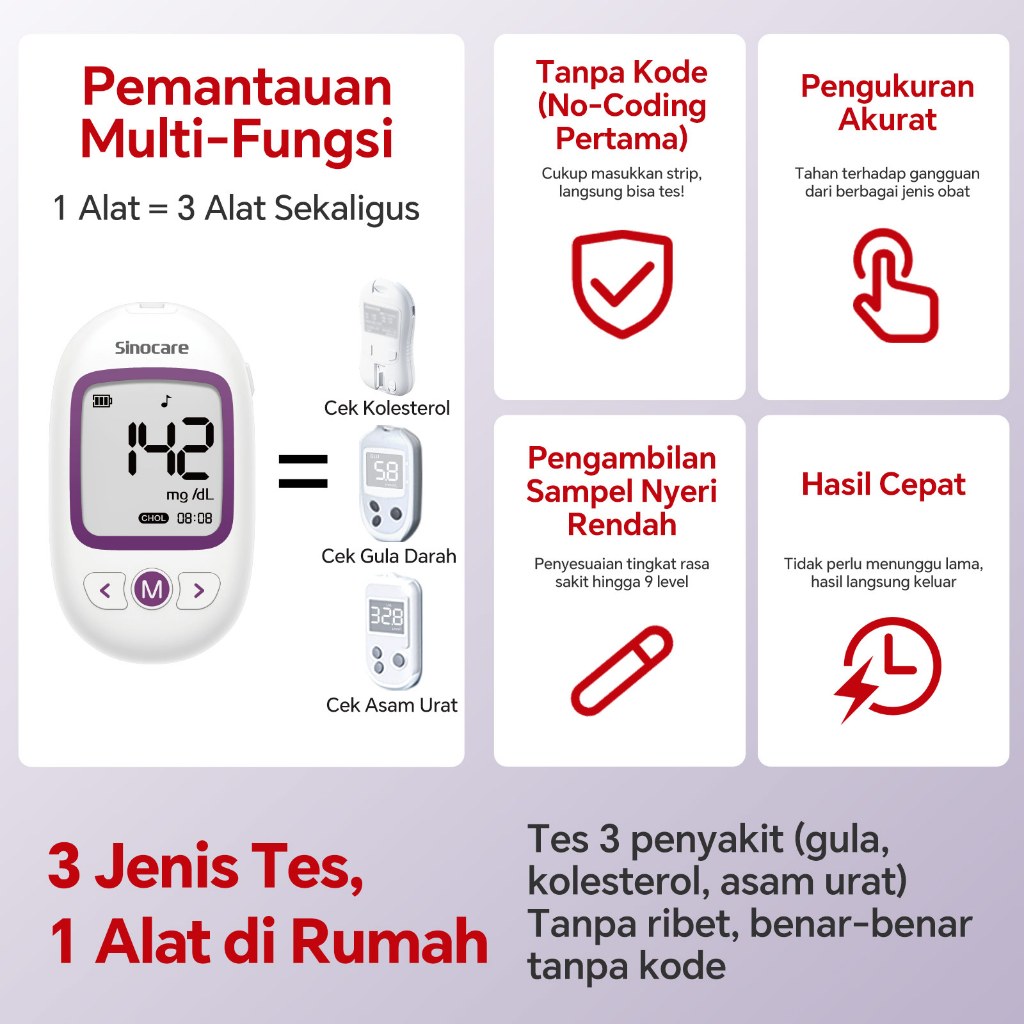 No ing Sinocare M101–GCU Alat Cek 3in1 Gula Darah, Kolesterol & Asam Urat Tanpa Koding