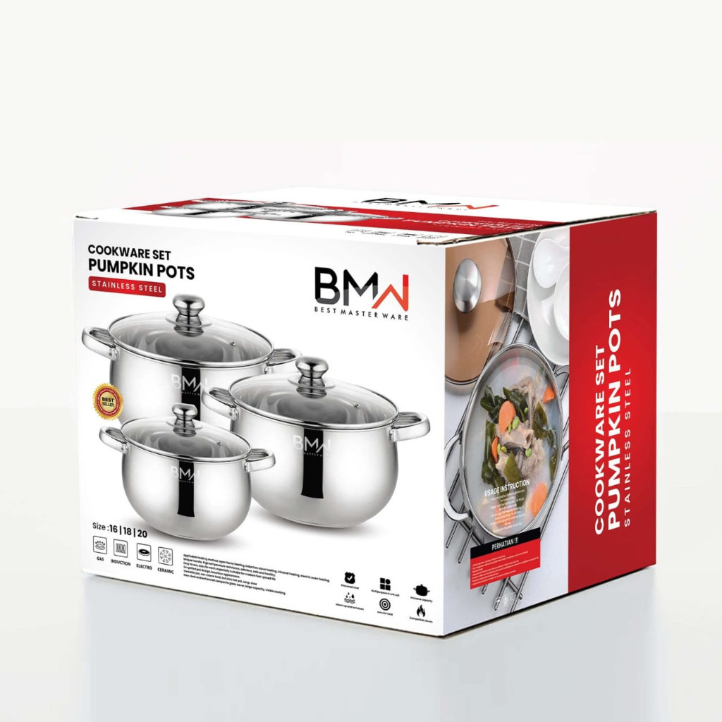 BMW Original Stainless Panci Soup Labu isi 3 Pcs Tutup Kaca Pumpkin Panci Rebus Set 3 Pcs Ukuran 16cm 18cm 20cm