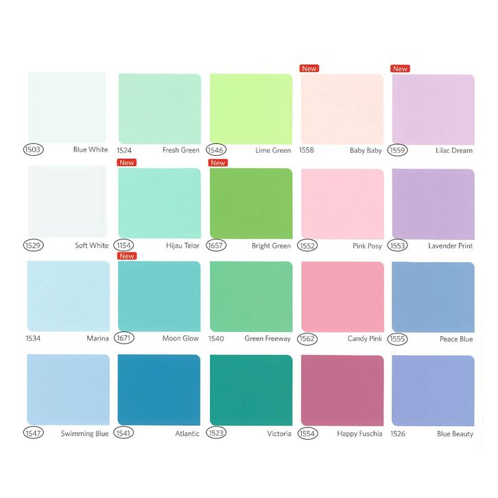 PAKET ALAT CAT, 1505 - PUTIH, 1502 - BRILIANTWHITE, 1515 - BARLEY WHITE, 1509 - LILY WHITE, 1154 - HIJAU TELOR, 1546 - LIME GREEN, 1523 - VICTORIA, 1547 - SWIMMING BLUE, 1541 - ATLANTIC, 1671 - MOON GLOW, 1553 - LAVENDERPRINT, 1552 - PINK POSY, 1562 - CANDY PINK, 1557 - SUNSHINE, 1117 - IVORY, 1518 - CREAM, 1556 - CAFE LATTE, 1560 - SAND STORM, 1131 - ORANGE TORCH, 1550 - GRAYCLOTH, 1549 - COPPER GREY, 1503 - BLUE WHITE, 1657 - BRIGHT GREEN, , Paket lengkap Alat cat