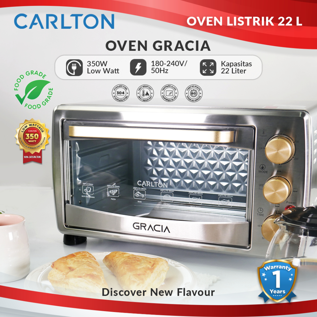 CARLTON Oven Listrik GRACIA 22 Liter Low Watt Pemanas Atas Bawah Stainles Steel Pemanggang Kue