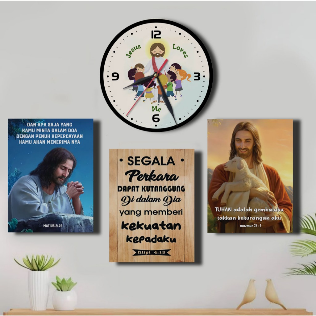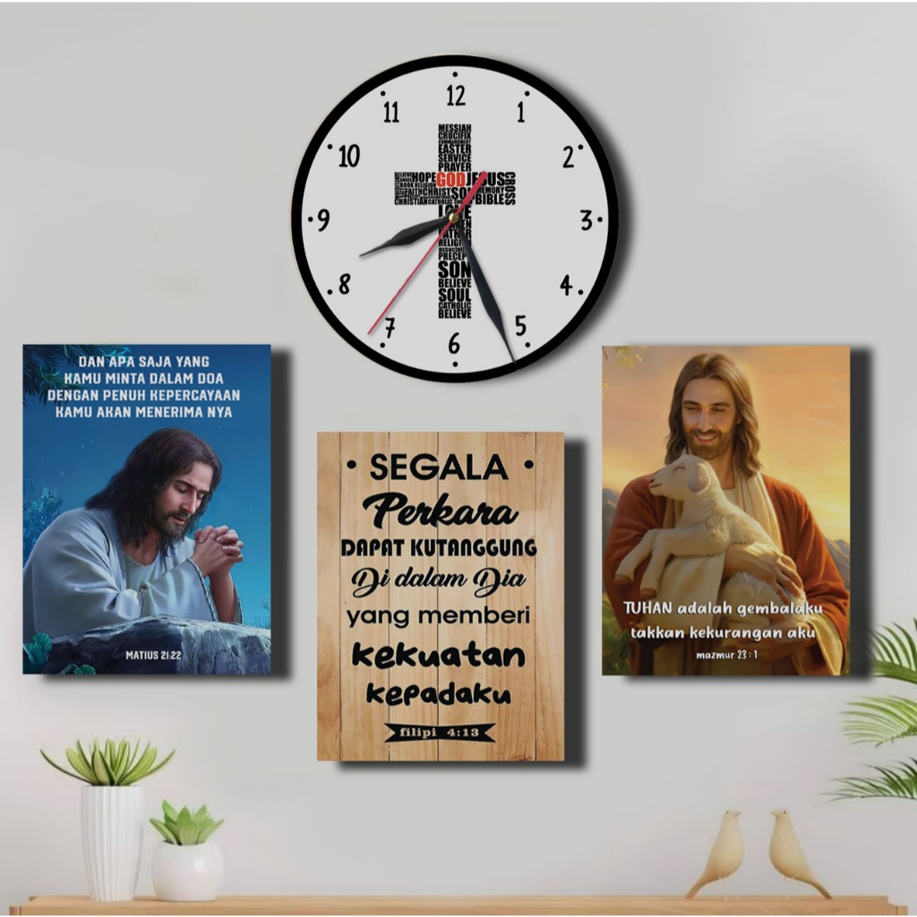 Jam Dinding Salib 1 SET Hiasan Dinding Kristen Gambar Yesus/ Poster Kayu Rohani Ayat Alkitab Kado