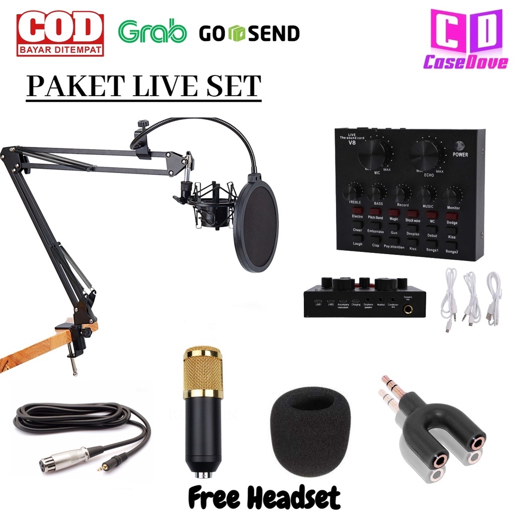 Paket Lengkap Mic Condenser Full Set Microphone Podcast BM 800 + Stand + Pop Filter + SoundCard V8S / V8S+ Bluetooth + S