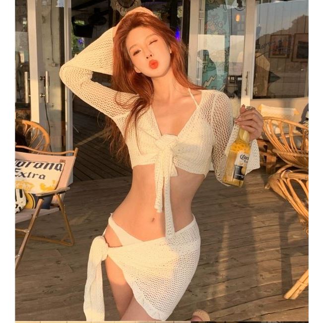Katata Bikini 4pc Premium Swimsuit Set Bikini Import Free Outer Motif Jaring Lengan Panjang Broken White BK85