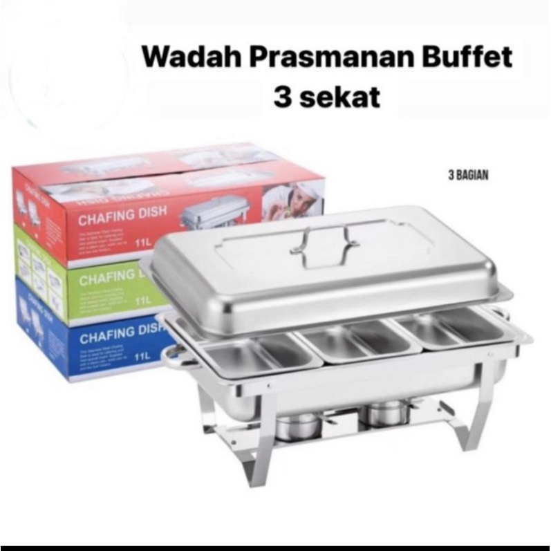 chafing dish 3 sekat 11 liter stainless / tempat prasmanan jumbo 3 sekat 11 liter / chafing dish sekat 12 liter / pemana