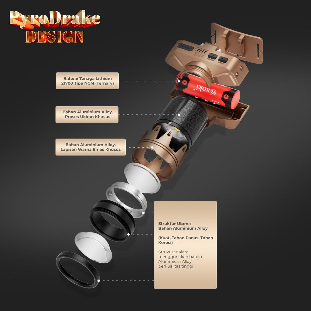 SENTER LED SUPER TERANG AOKI SENTER KEPALA PYRODRAKE | BISA MENYULUT API | SENSOR GERAK | 3 WARNA CAHAYA|USB RECHARGE