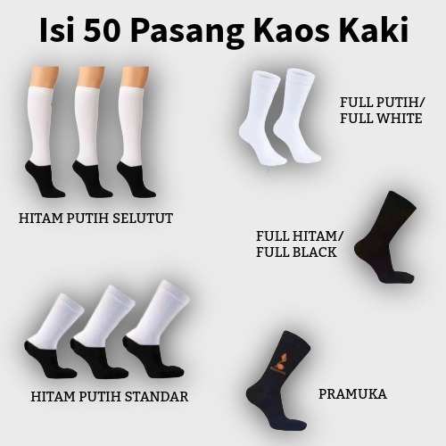 Isi 50 Pasang Kaos Kaki Hitam Putih / Pramuka / Full Putih / Full Hitam Sekolah / SD SMP SMA Bahan Katun Spandek Polyest