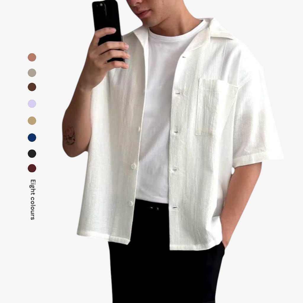 COMFYCLUB - Cuban Bowling Boxy Oversized Linen Shirt | Kemeja Linen Bowling Polos Pria Kerah Terbuka Lengan Pendek | 81