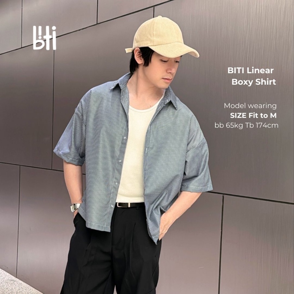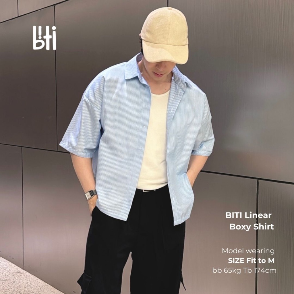 BITI Linear Boxy Shirt | Kemeja Oversize Biru Garis Stripe lengan pendek Casual Pria