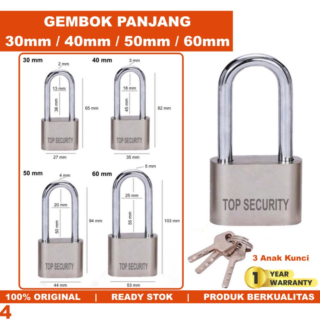 Gembok Panjang 30mm 40mm 50mm 60mm Pagar Pintu Rumah Gudang Ruko Kuat Aman Anti Maling Tahan karat