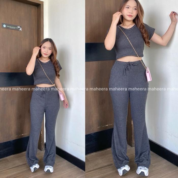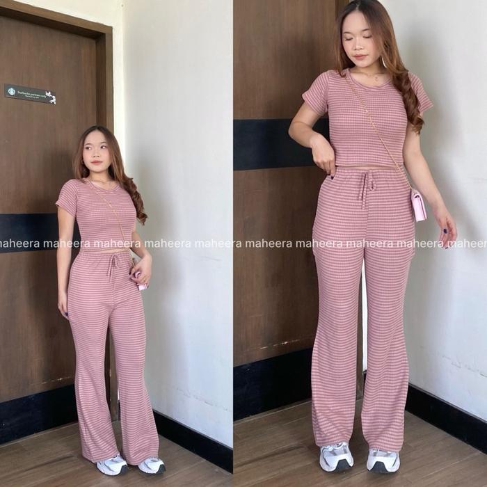 Maheera - Yooriko One Setelan Celana Panjang + Atasan Rib Abstrak Wanita Kekinian Kulot Baju Dewasa - Mustard, Satu Ukur