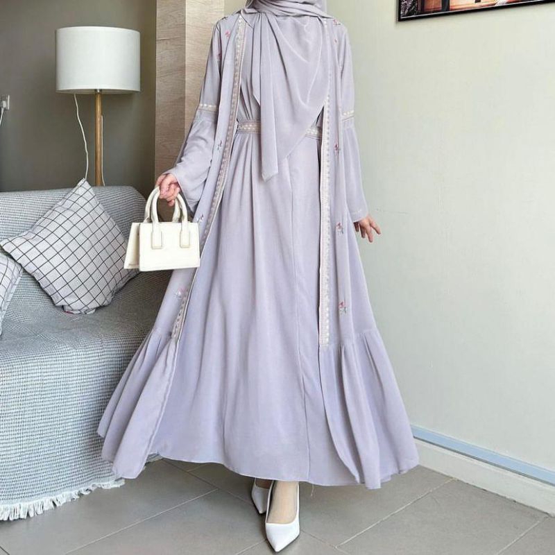 Safwa Abaya Dress Bordir Bahan Ceruty Babydol Full Furing Busui Friendly Dua Layer Tali Pinggang Dress Lebaran Wanita Fashionable Gamis Wanita