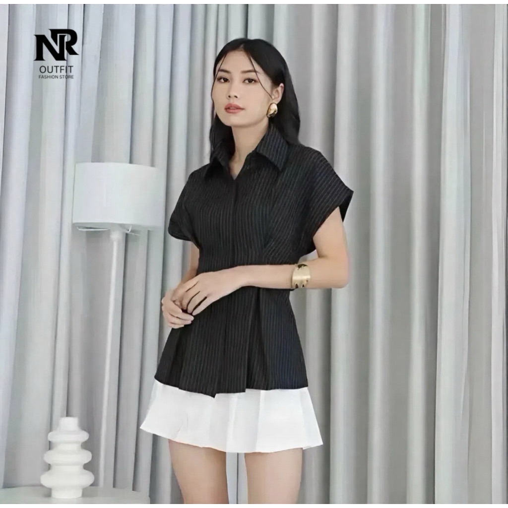 Alba Top - Atasan Wanita Lengan Pendek Slim Fit - Kemeja Wanita Fitted Stripe Salur Basic Casual Bahan Semi Woll - Kemej