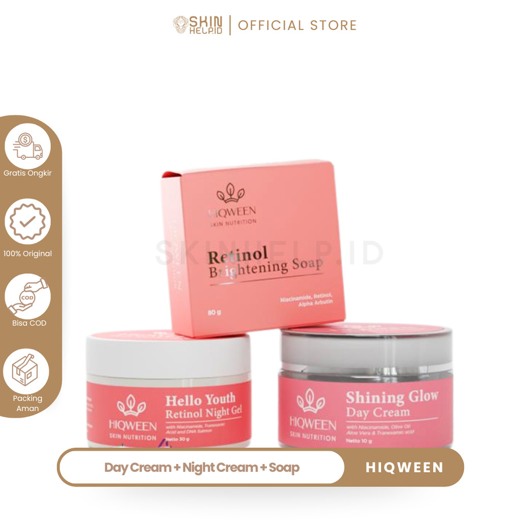 HIQWEEN - PAKET KINCLONG ANTI FLEK SABUN + RETINOL NIGHT GEL + SHINING GLOW DAY CREAM Krim Siang Malam Niacinamide Mence