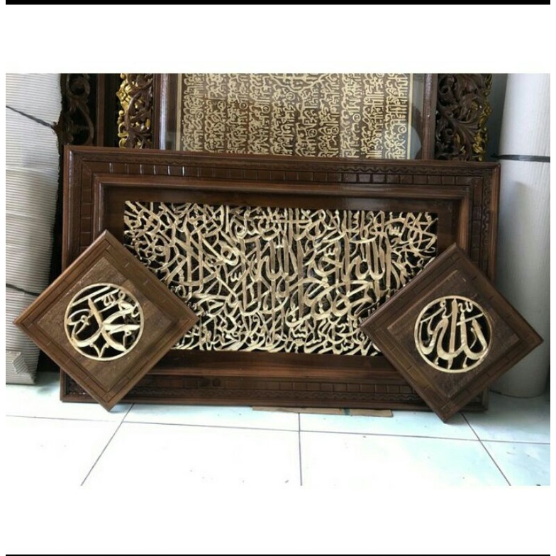 kaligrafi ayat kursi acak dan lafad allah muhammad kotak dari kayu jati