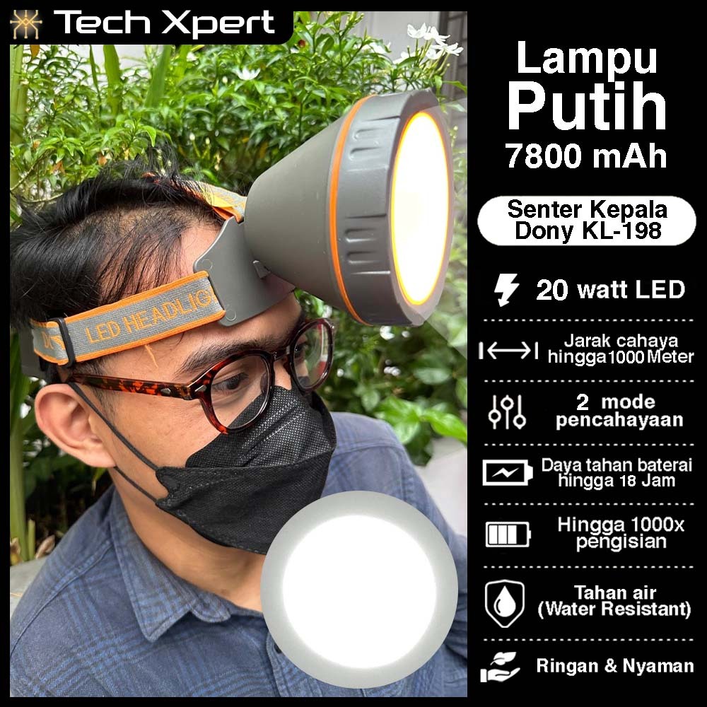 Senter Kepala Dony KL-198 LED 20W Baterai Jumbo Cahaya Putih & Kuning Super Terang-Waterproof