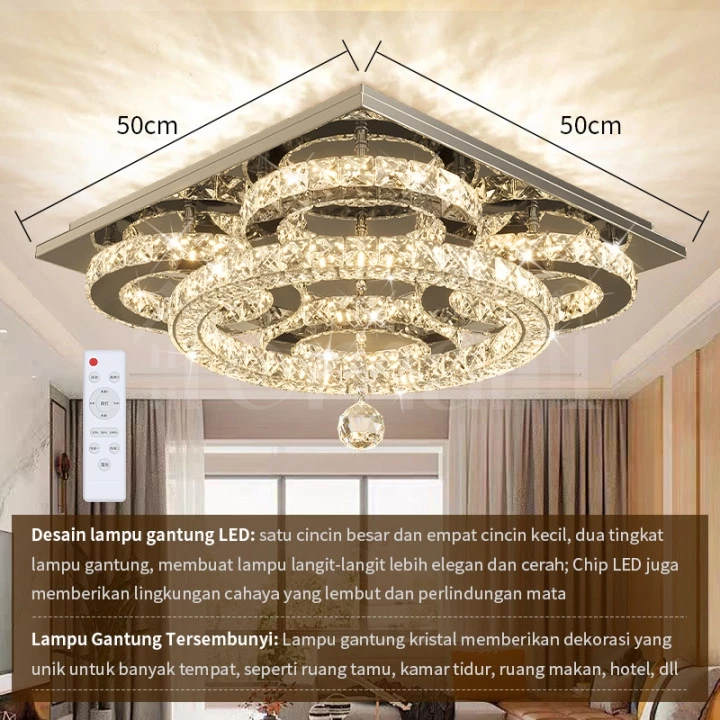 ✨Remote & ✨Lampu Plafon Kristals R Tamu Mewah Persegi Lampu Hias Gantung 50CM REMOTE CONTRONL 3 Warna Modern Lampu Hias