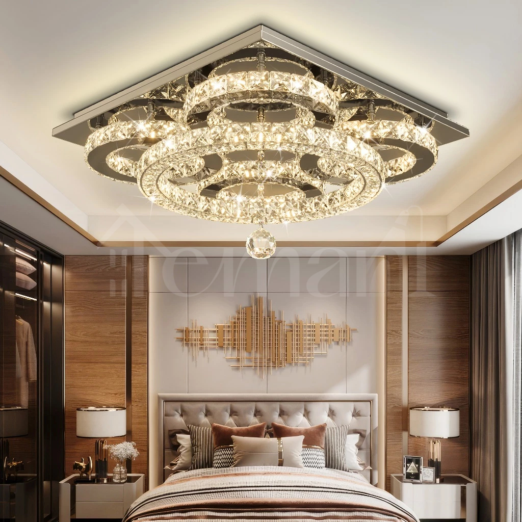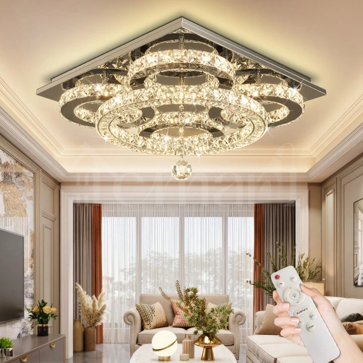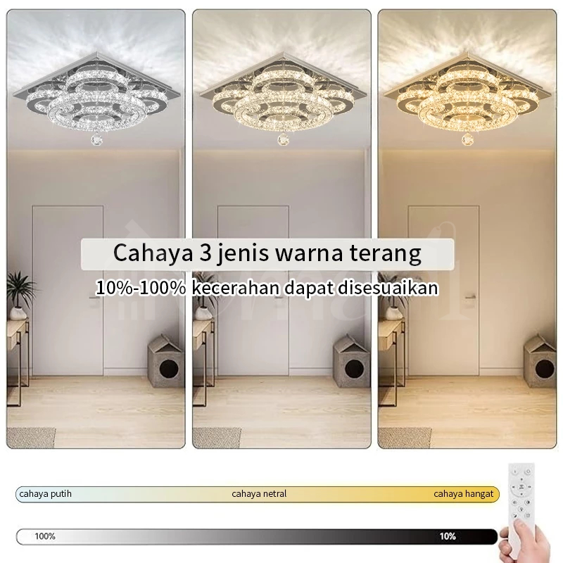 ✨Remote & ✨Lampu Plafon Kristals R Tamu Mewah Persegi Lampu Hias Gantung 50CM REMOTE CONTRONL 3 Warna Modern Lampu Hias