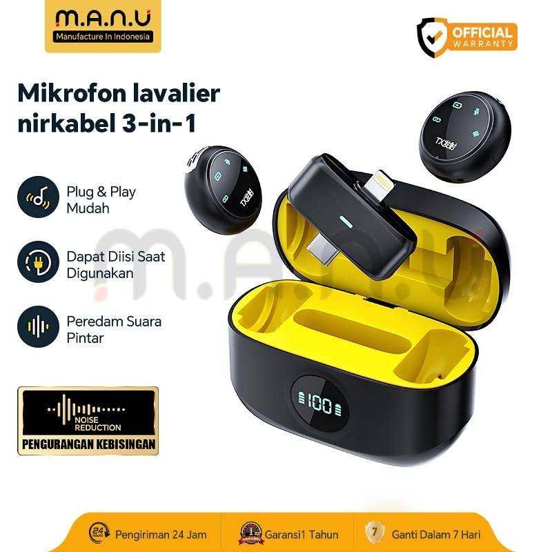 MANU Microphone Wireless Lavalier IOS & Type-C 2-In-1 Clip On Mic Magnetic Dual Mikrofon HP Plug & Play with Charging Ca