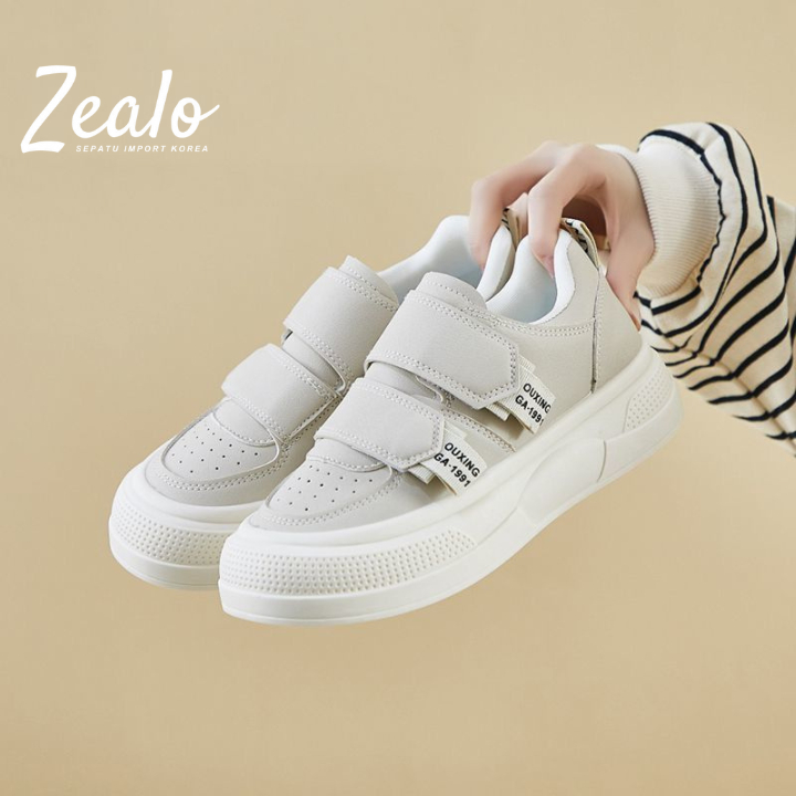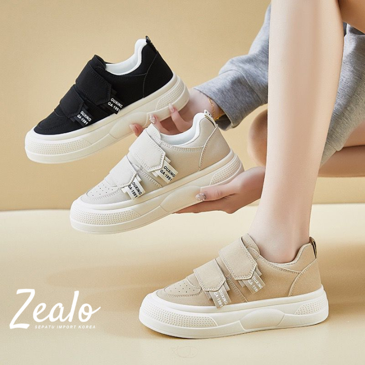 Zealo 382 Sepatu Sneakers Wanita Casual Fashion Slip On Korea Import Sporty Trendy Nyaman Velcro Hitam Cream Abu Ukuran 37-40 - Shoes