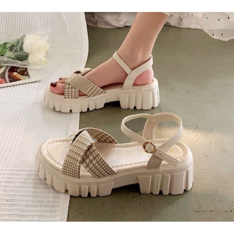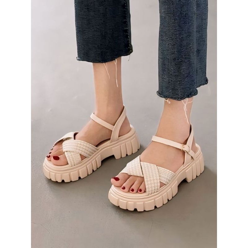 Sandal Wedges Wanita Tali Silang Kanvas Motif