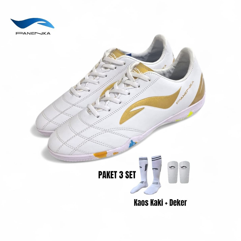PANENKA - Paket Komplit Sepatu Futsal Panenka Revolt White kuningan mengkilap Free Kaos Kaki Skin Deker Stringbag