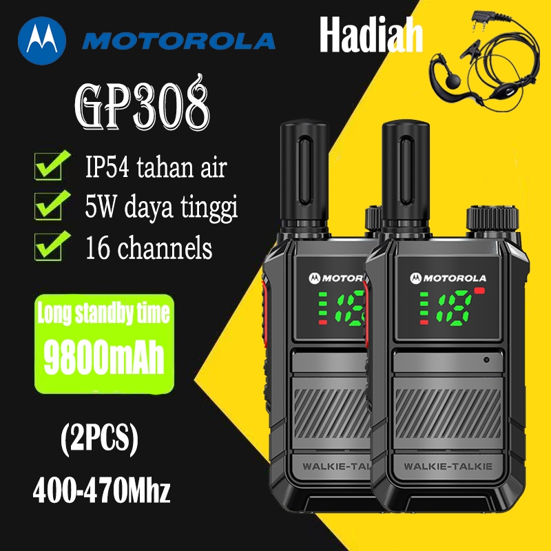 Hadiah Headphone HT Motorola GP308 High Power 5Watt 16Channels Mini Walkie Talkie UHF 400-470Mhz Long Range 10KM 9800mAh kapasitas baterai